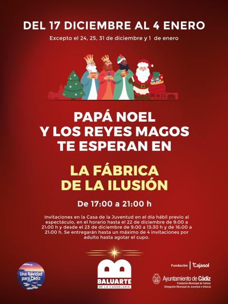La Delegación de Juventud e Infancia del Ayuntamiento de Cádiz convertirá el Baluarte de la Candelaria en la ‘Gran Fábrica de la Ilusión’, un pasaje teatralizado en el que más de 5.000 niñas y niños podrán disfrutar visitando las estancias en las que se preparan los regalos navideños que se repartirán en la ciudad y en el que tendrán la oportunidad de encontrarse con Papa Noel y los Reyes Magos.
