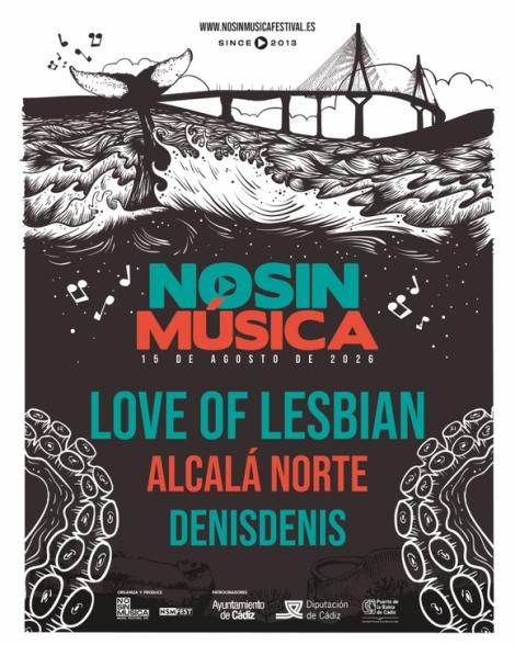 NOSINMÚSICA con el apoyo del Ayuntamiento y la Diputación de Cádiz en colaboración cn el Puerto de la Bahía de Cádiz, presenta un cartel potente y atractivo encabezado por uno de los grandes nombres del pop nacional que ha traspasado éxitos y fronteras, LOVE OF LESBIAN. Su décimo álbum de estudio “Ejército De Salvación” (2024) es un homenaje al colectivo, a la amistad y a esas personas que siempre están ahí. Sentimientos a flor de piel que dedican a ese público que no ha parado de demostrarles amor. Grandes canciones que refrescan el repertorio de la banda y que se podrán escuchar en riguroso directo, además de sus grandes éxitos, en Nosinmúsica 2026.
