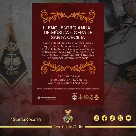El Gran Teatro Falla acogerá el 19 de octubre a partir de las 18 horas la tercera edición del Encuentro Anual de Música Cofrade ‘Santa Cecilia’ que organiza el Ayuntamiento de Cádiz a través de la Fundación Municipal de Cultura.